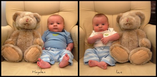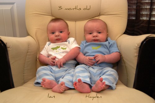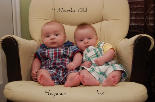 Our once preemie sized, 4 pound babies are now 4 months old…and NOT 4lbs anymore!! They have definitely gown up and filled out. They had a check up last Friday and are doing great. I believe the doctors words for Hayden were “he is perfect”. Hayden weighed in at 16.5 pounds and 23.6 inches and Ian weighed 13.5 pounds and was 23.2 inches long. We are adjusting both of their medications for reflux. We are going to switch Hayden from Zantac to Prevacid and we are keeping Ian on Zantac and Prevacid. The GI doc wanted us to wean him off the Zantac and we did wean him off the morning dose, but he wasn’t doing as well so the pedi said we can put keep him on both meds, just decrease the Zantac dose a little. She said we can start solid food now if we want to but she would probably prefer to wait a little while longer, especially with Ian. Hayden just downed 10 ounces last night before bed so I’m guessing he is going to be ready to start them pretty soon. They got some more shots and this time they definitely protested to let us know they did not appreciate getting poked.