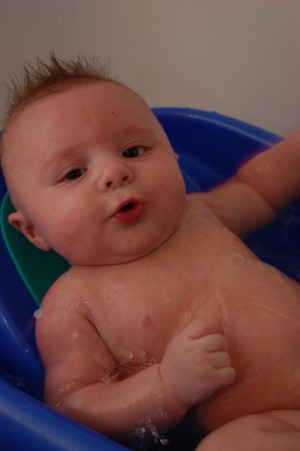 My little chunky monkey, Hayden is still our snuggle bug. He loves to be held and take a nap in your arms. I am all fine and dandy with that because I love to snuggle with him, but remember the whole thing about him being 16.5 pounds, ya that’s kinda heavy when you’re carrying him around all day!! He also loves to smile and laugh. When this boy smiles, his whole face smiles…his eyes light up and all. Hayden also loves to talk but he doesn’t do it as much as Ian. He will sit and listen to Ian talk most of the time, but once he starts he gets on a roll and will talk your ear off too. While Ian thinks its funny to get his clothes taken off, Hayden simply loves having his clothes off. He loves to be in nothing but a diaper. He is our hot natured boy! If he is fussy and we don’t know why, we just start taking his clothes off and usually he’s happy after that, but not always. Hayden actually rolled over from his tummy to his back for the first time about a week ago. He rolled over and had this big grin on his face…priceless!