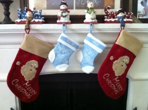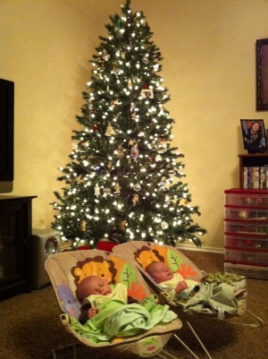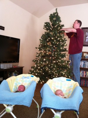 Things are starting to look a little like Christmas around the Blundell house. Last year we didn’t put up our tree because we were trying to sell the house and we would have to move furniture and that’s not the best idea when you are trying to do everything you can to sell a house. Well, this year we did put it up. We had to have a tree up for the boys first Christmas. So this past weekend we decorated for Christmas. We didn’t do a whole lot…it was a lot of work just to put up a tree and stockings on the fireplace when you have 2 newborns demanding your attention, but we did get it all put up. The boys even helped dad put up the tree…